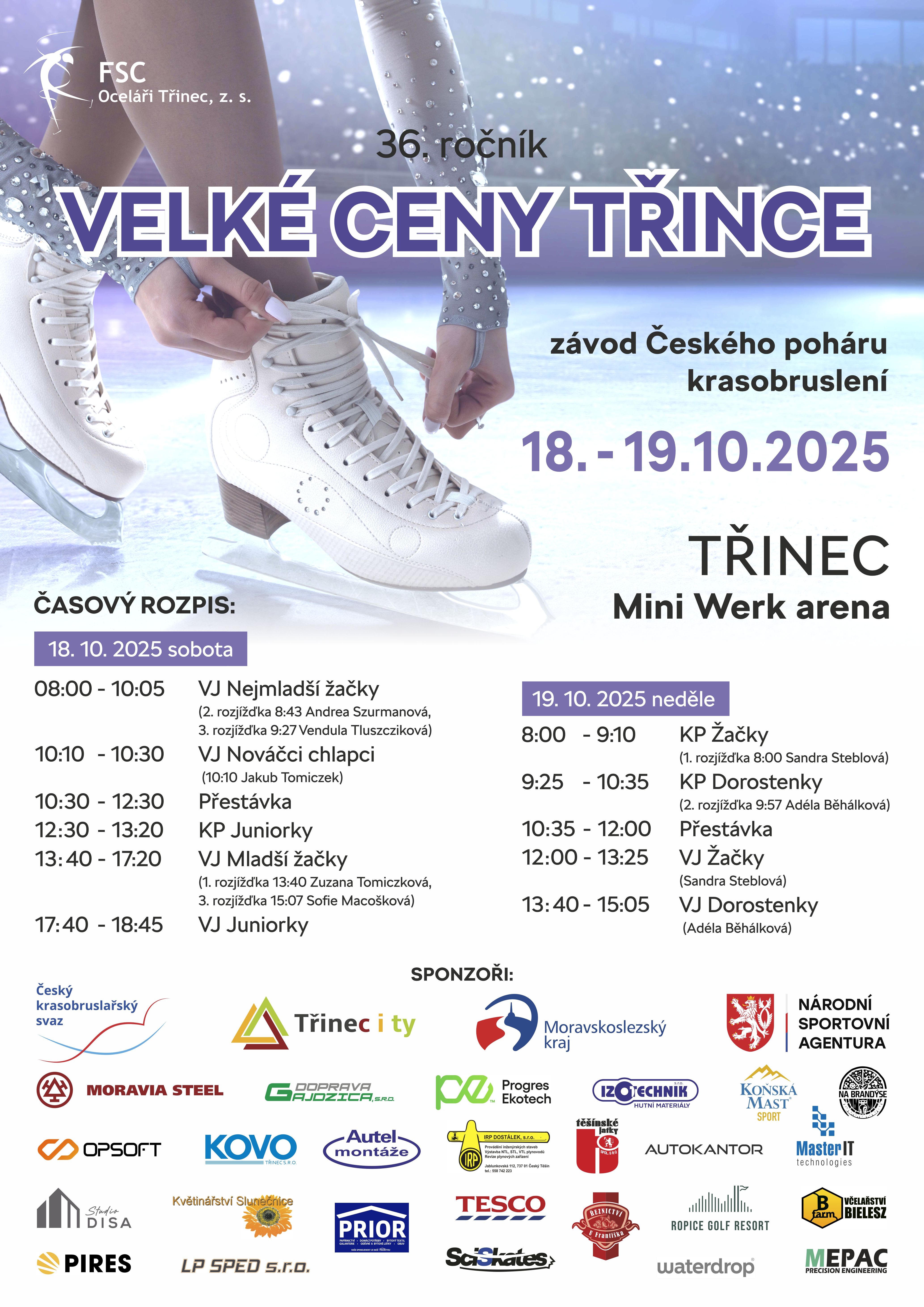 36. ročník Velké ceny TřinceO víkendu 18.-19.10.2025 bude třinecký krasobruslařský klub hostit další závod Českého Poháru, a to 36. ročník Velké ceny Třince. V tomto závodě se představí hned sedm domácích závodníků. Držíme palce. Pro předplatitele je možné závod sledovat zde: On-line přenos Výsledky závodu jednotlivých kategorií zde: Výsledky |